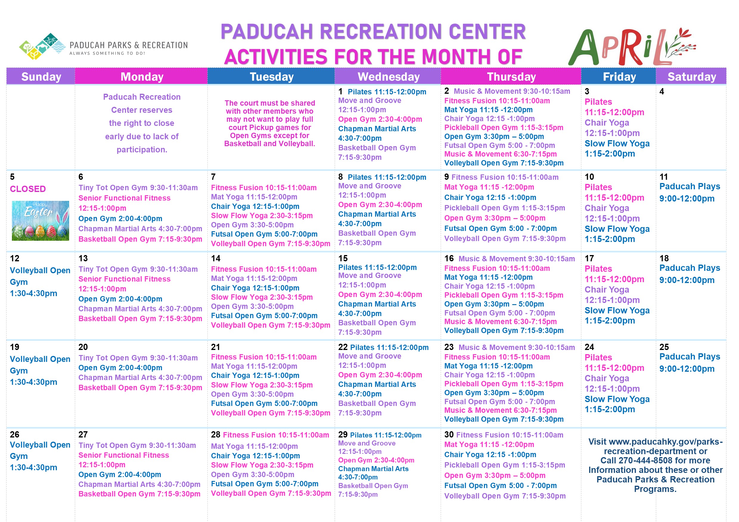 - Paducah parks & Recreation is not responsible for lost or stolen items.